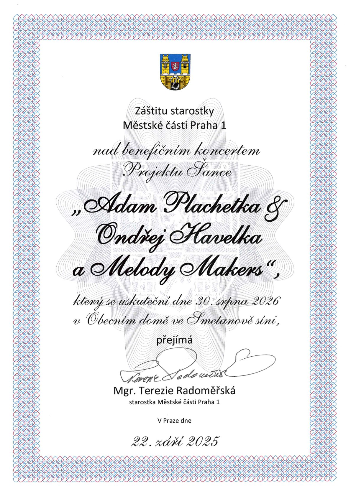 Starostka městské části Praha 1 paní Terezie Radoměřská vyhověla naší žádosti a převzala záštitu nad benefičním koncertem Projektu Šance „Adam Plachetka & Ondřej Havelka a jeho Melody Makers“.